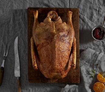 10. Place the goose onto a clean tray and keep warm by covering with a sheet of tin foil. Rest for 30 minutes before carving.