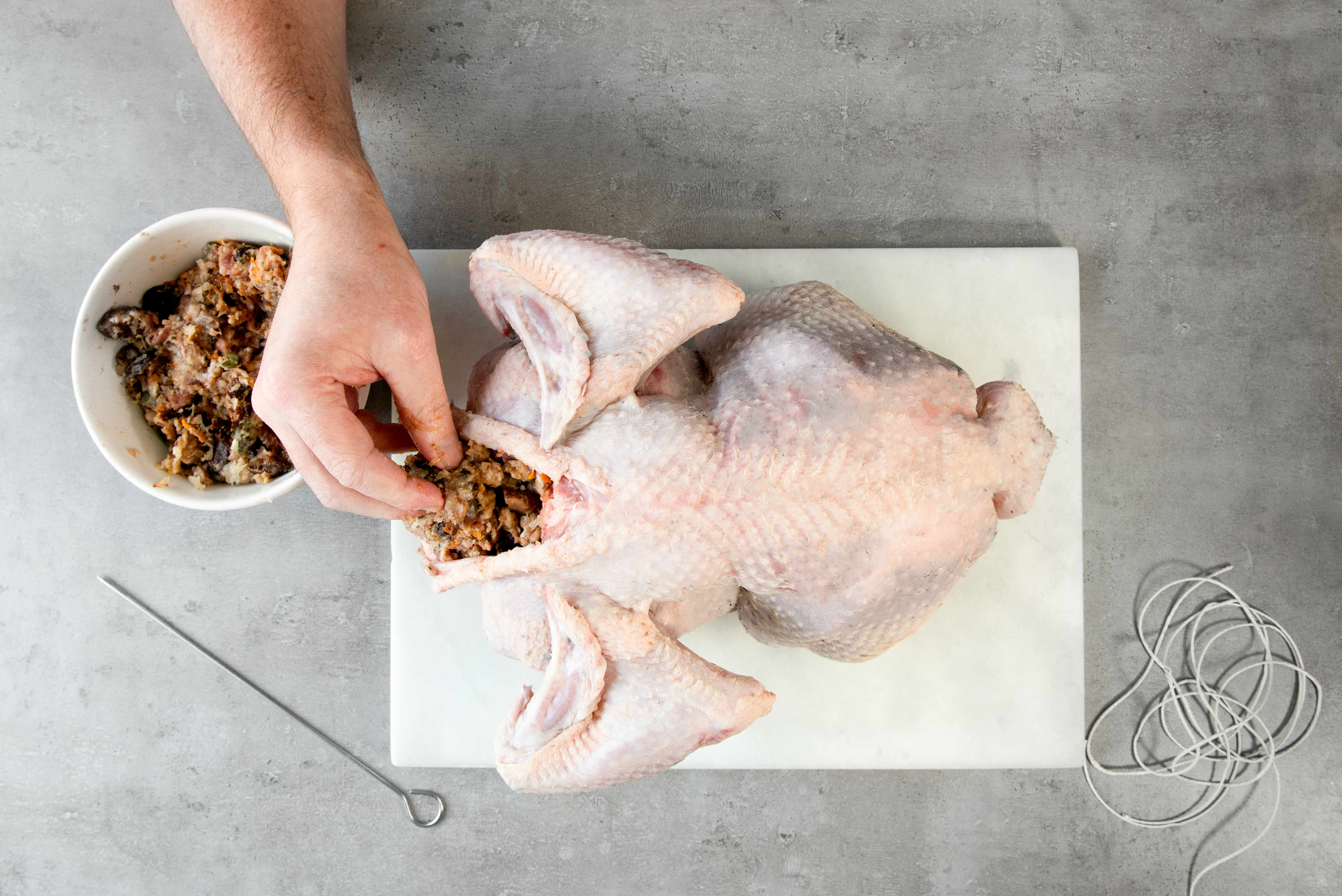 6. Next, loosely spoon the remaining stuffing into the body cavity. Tie the drumsticks together with kitchen (butchers) string.