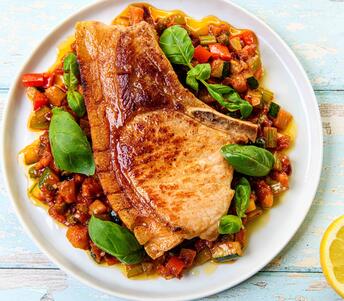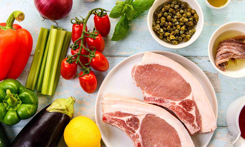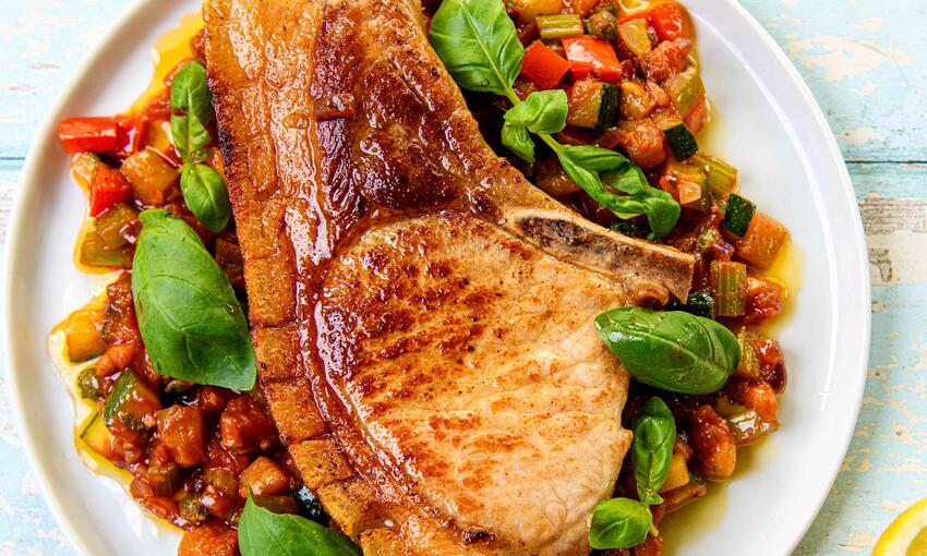 A simple dish showcasing free range pork at its best with a Sicilian style Caponata, the ratatouille of Italy, best served warm to allow all those amazing flavours burst out onto the palette. This quantity will make a little more than you require so keep for another day, it's perfect with soft boiled eggs & freshly baked ciabatta, grilled fish or chicken.Method