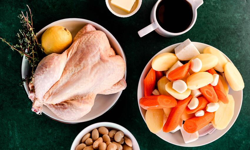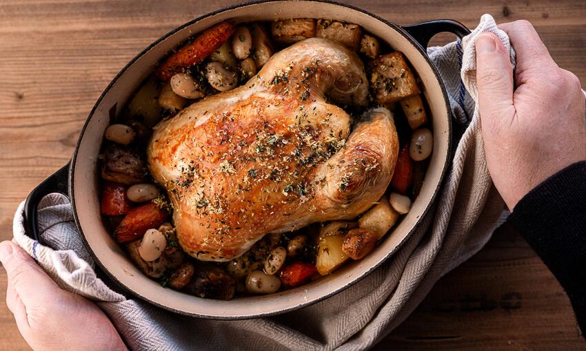 ‘Poulet au pot’ a great French country classic, chicken pot roasted with wine , herbs & vegetables all in one pot to capture bold yet simple flavours. The quality of the chicken is paramount & the beans add extra richness to the roasting juices.Method