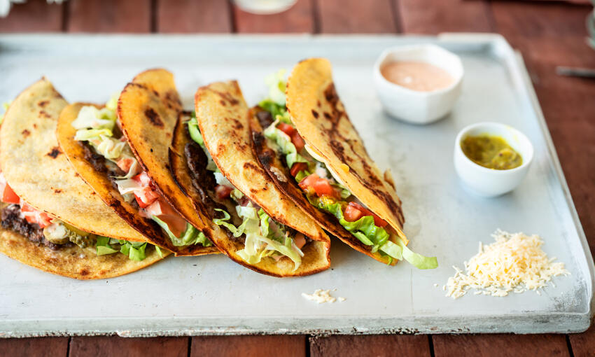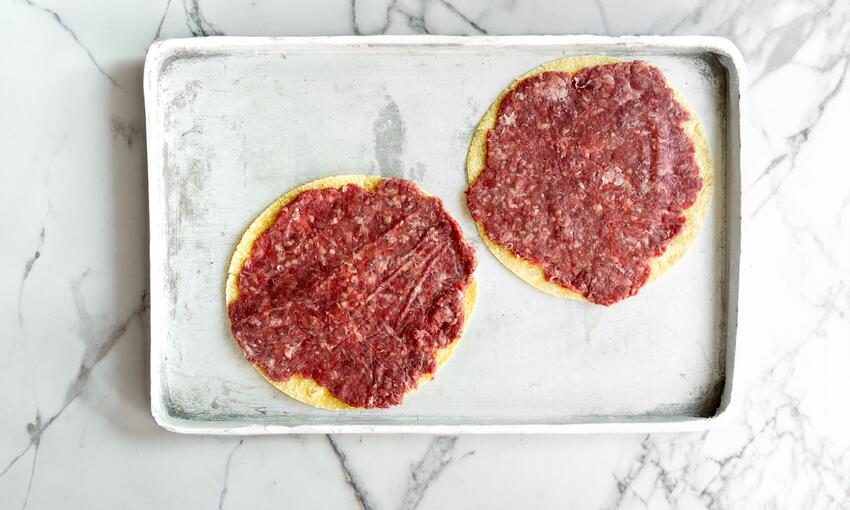 Separate the raw beef into 6 to 8 equal parts approximately 75g per taco & roll the beef down onto your tortillas to create an even thin layer covering the entire surface of the tortillas. Sprinkle the beef with sea salt & cracked black pepper.