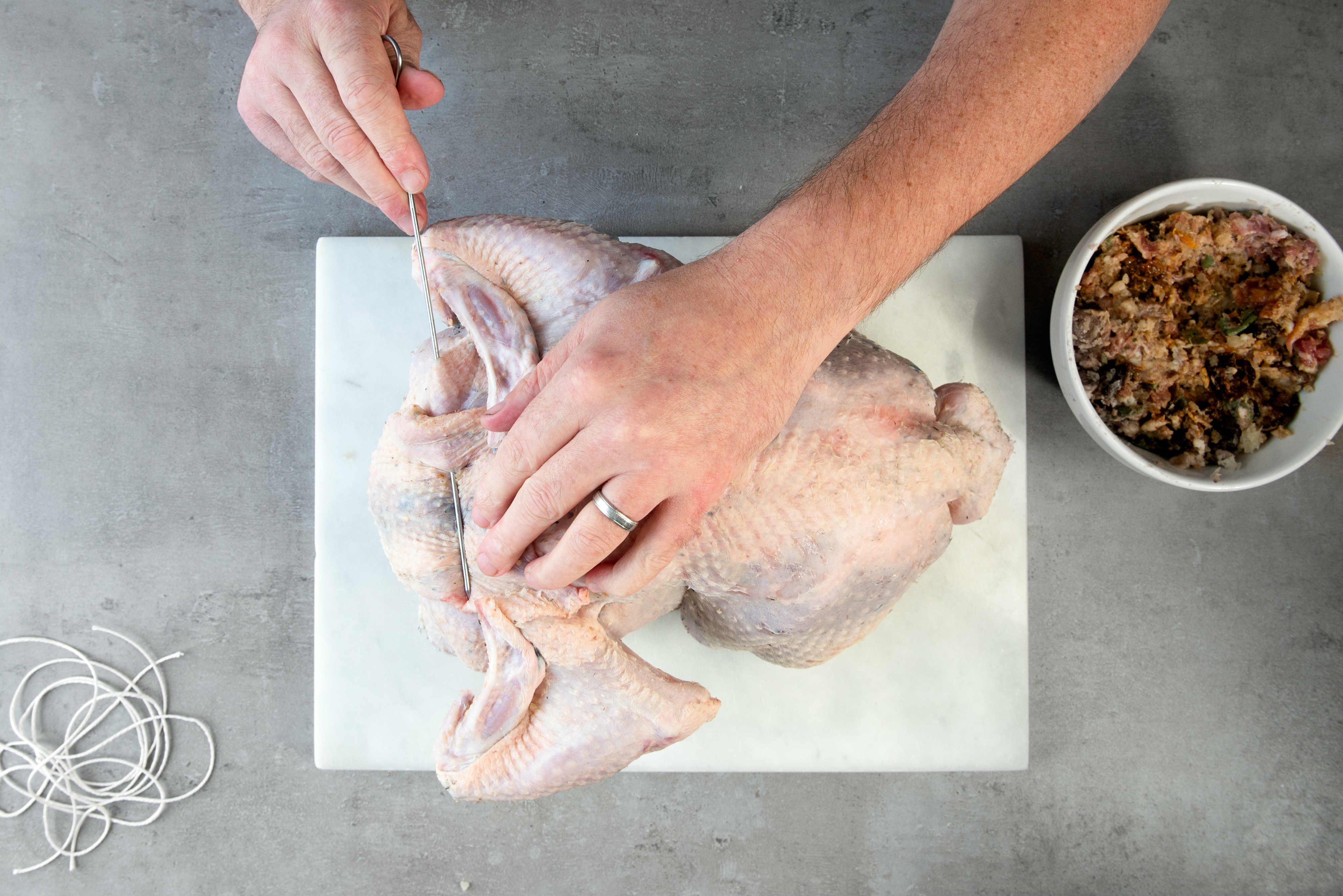 6. Next, loosely spoon the remaining stuffing into the body cavity. Tie the drumsticks together with kitchen (butchers) string.